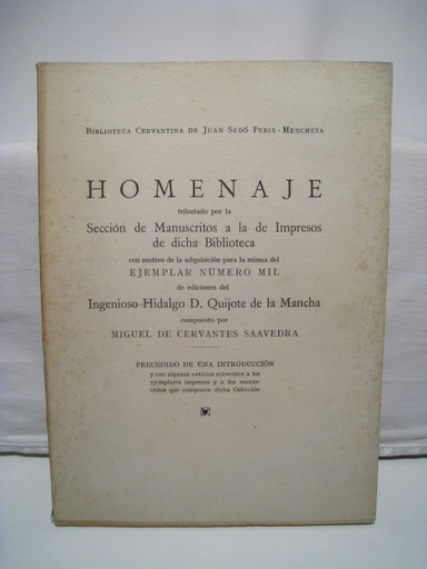 Biblioteca Cervantina de Juan Sedo Peris-Mencheta HOMENAJE tributado por la seccion de Manuscritos a la de Impresos de dicha biblioteca Referencia: 12062.