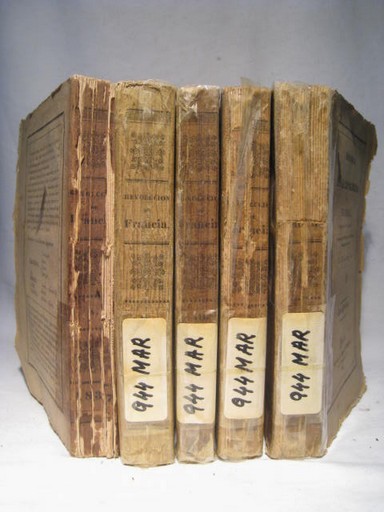 Ed. Imp. Joaquin Verdaguer; Barcelona. 1834. Castellano. Rustica. 5 vols. 19x12 cms. 328+332+278+446+320 pags. Entre 1834 y1837. Lomeras desgastadas y reparadas. Cantos y margenes rozados. Cubiertas y hojas tostadas por el tiempo. Puntos de oxido. Sello y marca de anterior poseedor.. HISTORIA.