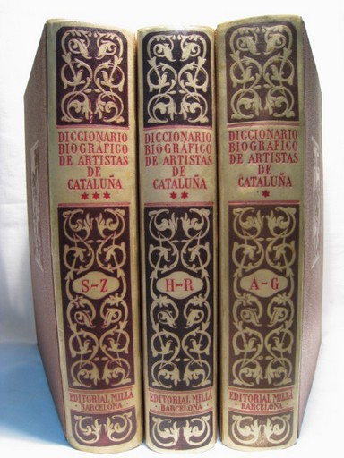 Ed. MILLA; Barcelona. 1951. Castellano. Holandesa tela con lomo en piel y grabados. 3 vols. 25x18 cms. 1681 pags. Paginas por tomo 542, 519, 620. Texto a dos columnas. Contiene ilustraciones en sepia en laminas fuera del texto. Cortes superiores tintados. Bien conservados salvo pequeña mancha de humedad en el margen inferior de las cubiertas.. DICCIONARIO. BIOGRAFIA. CATALUNYA.